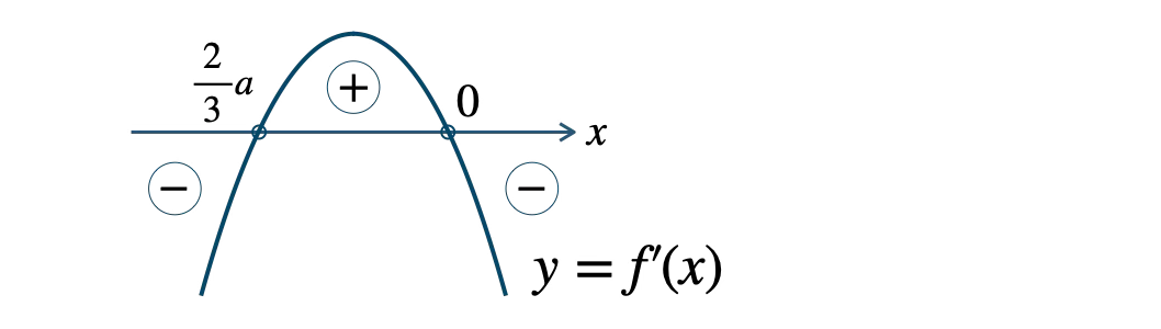 \(x \lt \displaystyle \frac{\,2\,}{\,3\,}a\) のとき、\(f^{\prime}(x) \lt 0\)