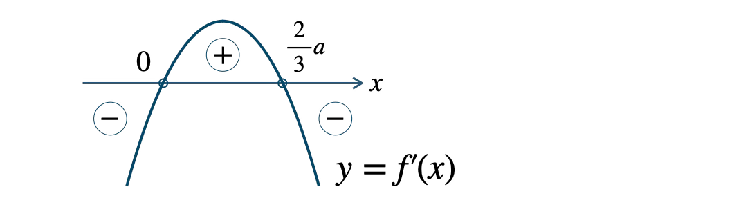 \(0 \lt x \lt \displaystyle \frac{\,2\,}{\,3\,}a\) のとき、\(f^{\prime}(x) \gt 0\)