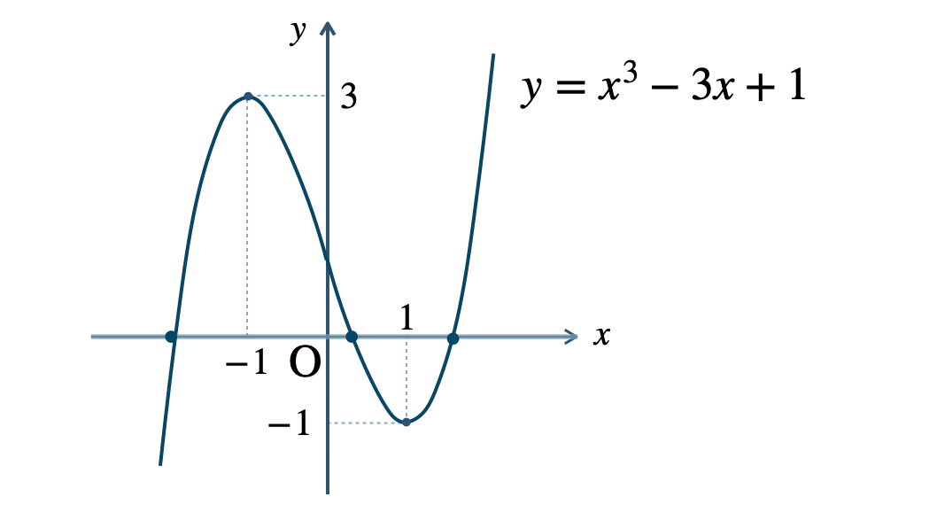 3次方程式 \(x^3-3x+1=0\) の異なる実数解の個数は3個となる