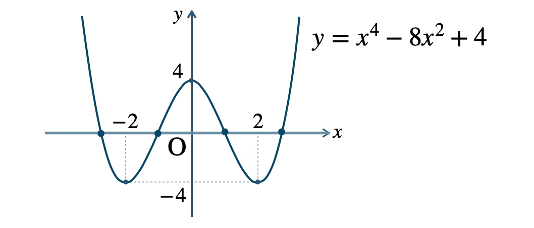 4次方程式 \(x^4-8x^2+4=0\) の異なる実数解の個数は4個となる