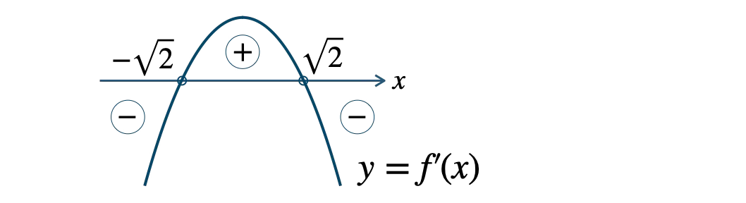 \(-\sqrt{2} \lt x \lt \sqrt{2}\) のとき、\(f^{\prime}(x) \gt 0\)