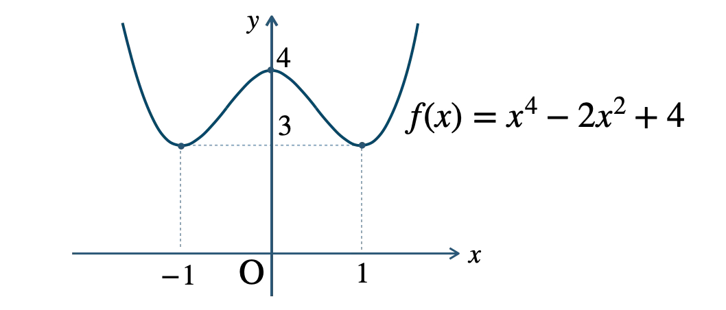 これより、\(f(x)\) は \(x=-1~,~1\) のとき最小値 \(3\) をとるので、