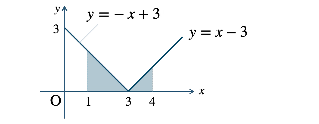 \(\displaystyle\int_{1}^{3}(-x+3)\,dx+\displaystyle\int_{3}^{4}(x-3)\,dx\)