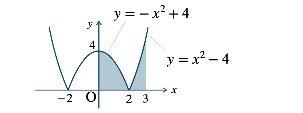 \(\begin{eqnarray}~~~&&\displaystyle\int_{0}^{2}(-x^2+4)\,dx+\displaystyle\int_{2}^{3}(x^2-4)\,dx