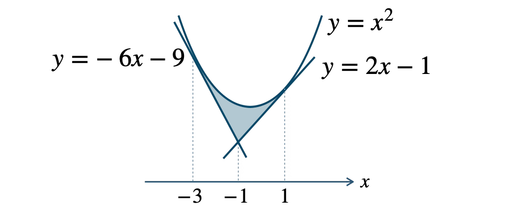 放物線 \(y=x^2\) とこの放物線上の点 \((1~,~1)\) 、\((-3~,~9)\) における2本の接線で囲まれた図形の面積の求め方は?
