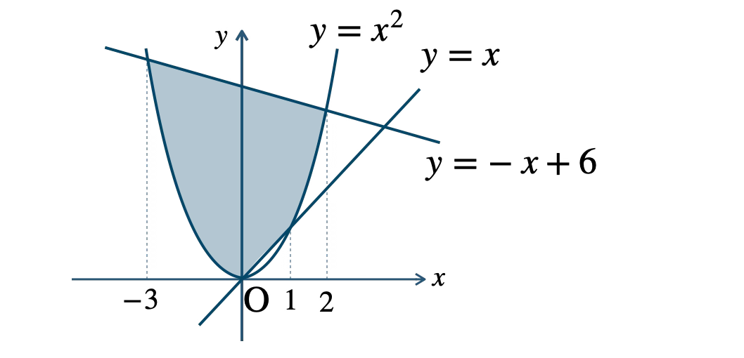 区間 \([-3~,~2]\) の直線 \(y=-x+6\) が上側、放物線 \(y=x^2\) が下側の部分から、区間 \([0~,~1]\) の直線 \(y=-x+6\) が上側、直線 \(y=x\) が下側の部分を引けば良いので、