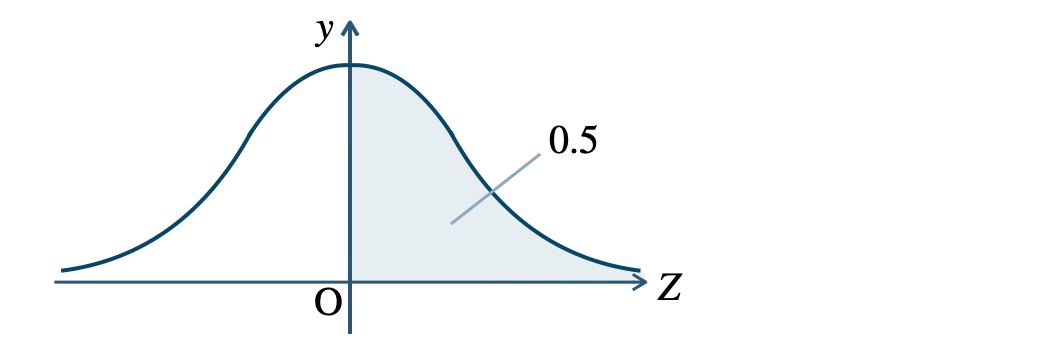 \(\begin{eqnarray}~~~P(\,Z{\small ~≧~}0\,)=P(\,Z{\small ~≦~}0\,)=0.5