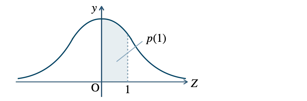 \(P(\,0{\small ~≦~}Z{\small ~≦~}1\,)\) はグラフの \(0{\small ~≦~}Z{\small ~≦~}1\) の面積が \(p(1)\) となるので、正規分布表より、