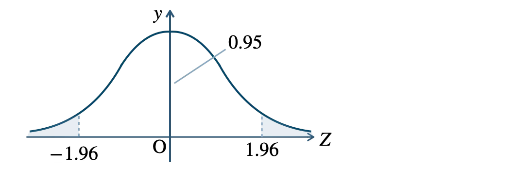 \( P(\,-1.96{\small ~≦~}Z{\small ~≦~}1.96\,){\small ~≒~}0.95 \) より、