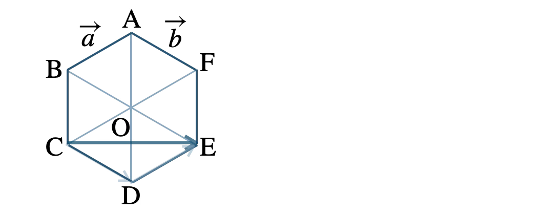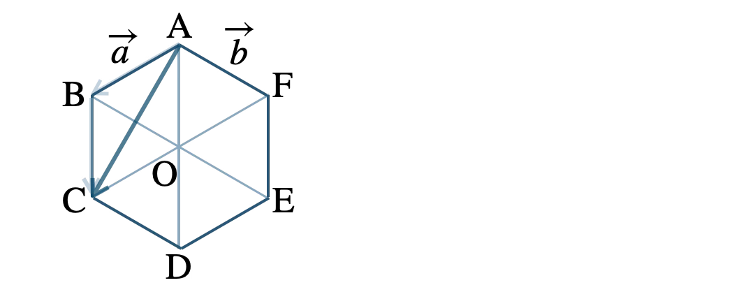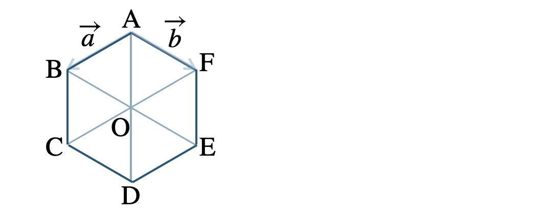 正六角形 \({\rm ABCDEF}\) とその対角線の交点 \({\rm O}\) において、\(\overrightarrow{\rm AB}=\overrightarrow{a}~,~ \)\(\overrightarrow{\rm AF}=\overrightarrow{b}\) とすると、