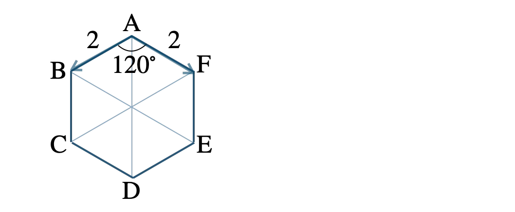 \(|\,\overrightarrow{\rm AB}\,|=2~,~|\,\overrightarrow{\rm AF}\,|=2\)、なす角 \(\theta=120^\circ\)