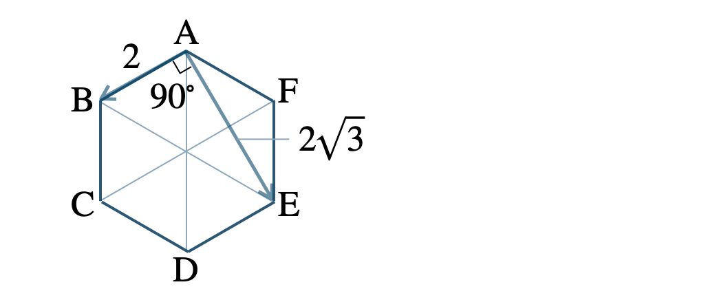 \(|\,\overrightarrow{\rm AB}\,|=2~,~|\,\overrightarrow{\rm AE}\,|=2\sqrt{3}\)、なす角 \(\theta=90^\circ\)