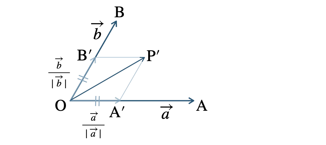 \(\overrightarrow{p}=t\left(\displaystyle\frac{\,\overrightarrow{a}\,}{\,|\,\overrightarrow{a}\,|\,}+\frac{\,\overrightarrow{b}\,}{\,|\,\overrightarrow{b}\,|\,}\right)\) で表される点 \({\rm P}(\overrightarrow{p})\) は \(\angle {\rm AOB}\) の二等分線上にある。[終]