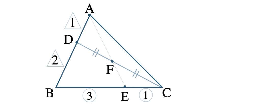 問題アーカイブ02\(\triangle {\rm ABC}\) において、辺 \({\rm AB}\) を \(1:2\) に内分する点を \({\rm D}\)、辺 \({\rm BC}\) を \(3:1\) に内分する点を \({\rm E}\) とし、線分 \({\rm CD}\) の中点を \({\rm F}\) とする。このとき、3点 \({\rm A}~,~{\rm F}~,~{\rm E}\) は一直線上にあることを証明せよ。