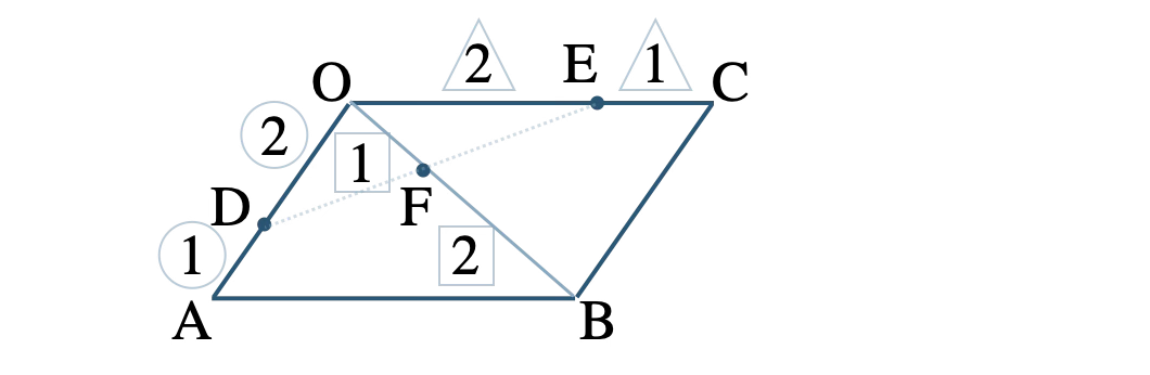 また、点 \( \rm F \) は対角線 \( \rm OB \) を \(1:2\) に内分するので、