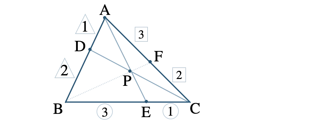 問題アーカイブ04\(\triangle {\rm ABC}\) において、辺 \({\rm AB}\) を \(1:2\) に内分する点を \({\rm D}\)、辺 \({\rm BC}\) を \(3:1\) に内分する点を \({\rm E}\)、辺 \({\rm CA}\) を \(2:3\) に内分する点を \({\rm F}\) とする。また、線分 \({\rm AE}\) と線分 \({\rm CD}\) の交点を \({\rm P}\) とするとき、次の問いに答えよ。