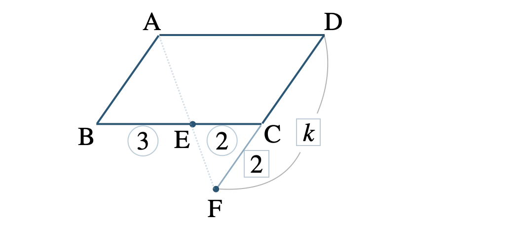 問題アーカイブ06平行四辺形 \({\rm ABCD}\) の辺 \({\rm BC}\) を \(3:2\) に内分する点を \({\rm E}\)、辺 \({\rm CD}\) を \(2:k\) に外分する点を \({\rm F}\) とする。3点 \({\rm A}~,~{\rm E}~,~{\rm F}\) が一直線上にあるとき、\(k\) の値を求めよ。