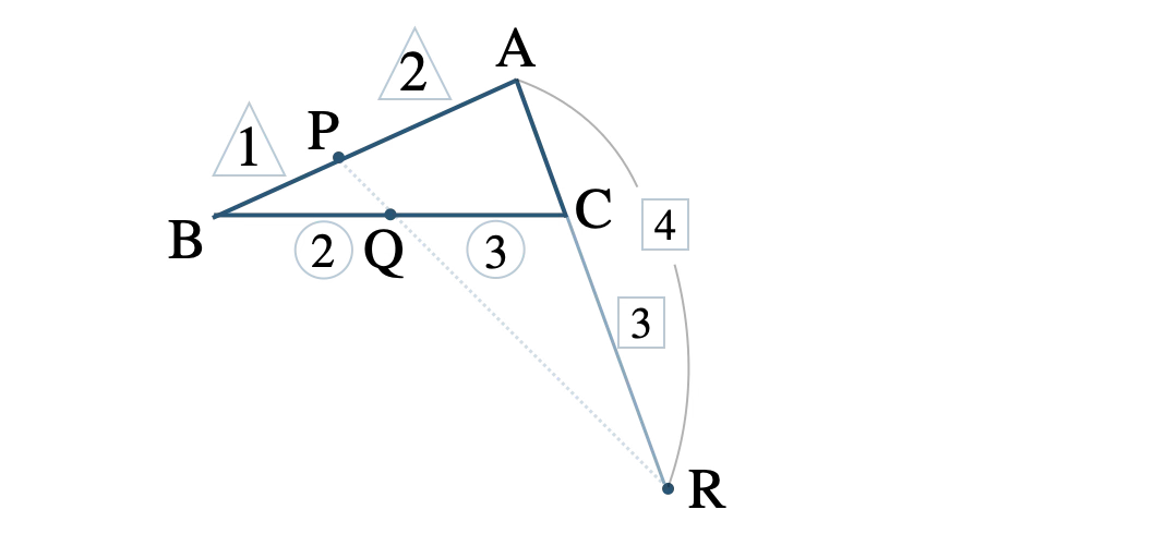 問題アーカイブ07\(\triangle {\rm ABC}\) で、辺 \({\rm AB}\) を \(2:1\) に内分する点を \({\rm P}\)、辺 \({\rm BC}\) を \(2:3\) に内分する点を \({\rm Q}\)、辺 \({\rm CA}\) を \(3:4\) に外分する点を \({\rm R}\) とそれぞれ定める。このとき、3点 \({\rm P}~,~{\rm Q}~,~{\rm R}\) は一直線上にあることを証明せよ。