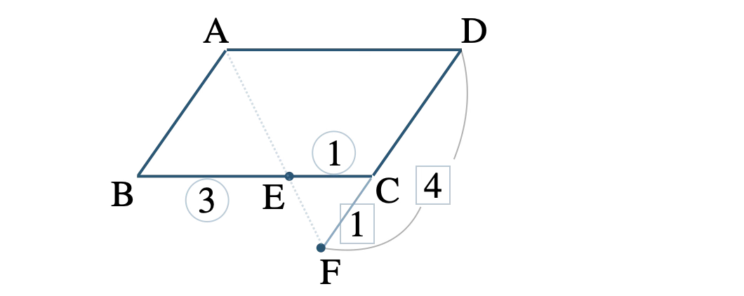 問題アーカイブ09平行四辺形 \({\rm ABCD}\) の辺 \({\rm BC}\) を \(3:1\) に内分する点を \({\rm E}\)、辺 \({\rm CD}\) を \(1:4\) に外分する点を \({\rm F}\) とすると、3点 \({\rm A}~,~{\rm E}~,~{\rm F}\) は一直線上にあることを証明せよ。
