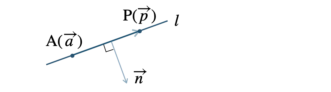 点 \({\rm A}(\overrightarrow{a})\) を通り、法線ベクトルが \(\overrightarrow{n}=(a~,~b)\) の直線は、直線上の任意の点を \({\rm P}(\overrightarrow{p})\) とすると、