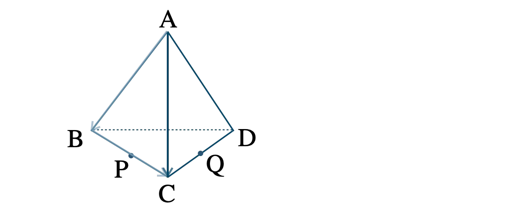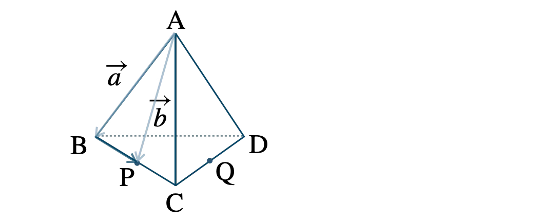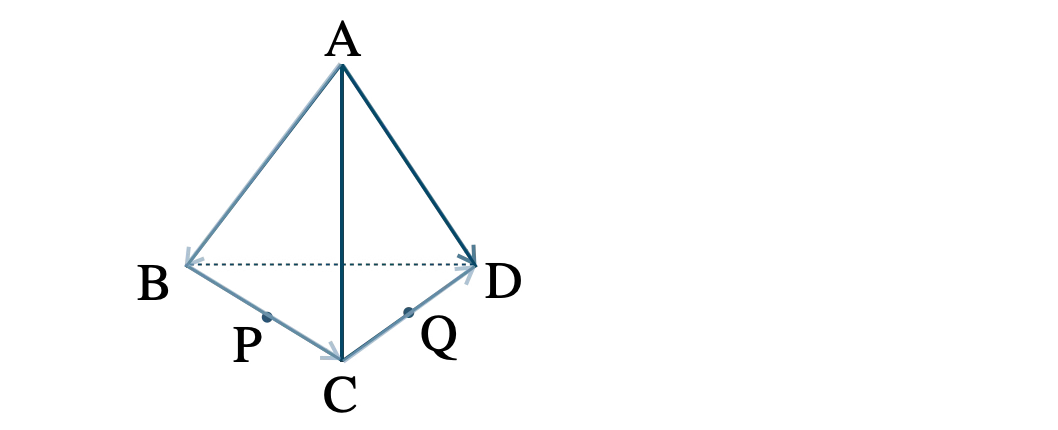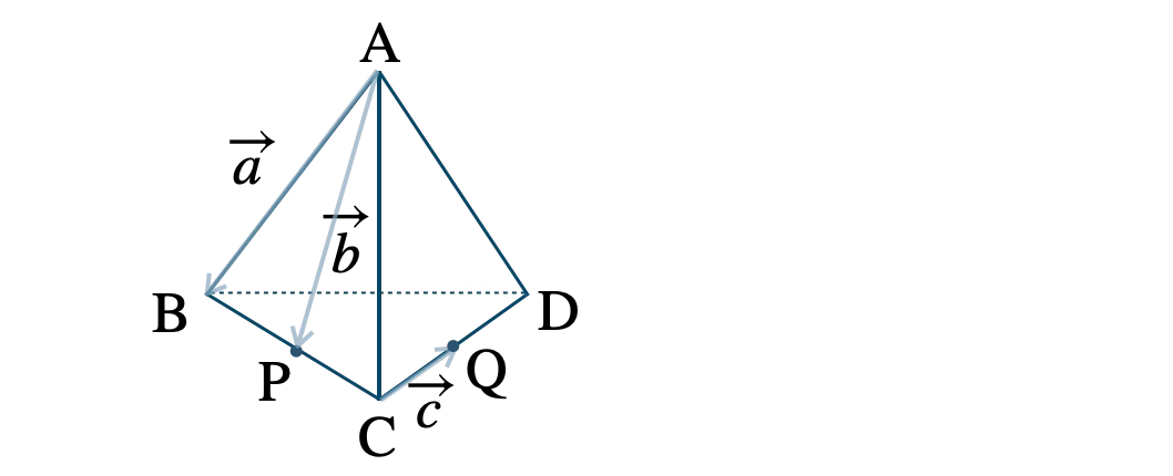 四面体 \(\rm ABCD \) において、辺 \(\rm BC \) の中点を \(\rm P \) 、辺 \(\rm CD \) の中点を \(\rm Q \) として、\( \overrightarrow{\rm AB}=\overrightarrow{a}~,~\)\( \overrightarrow{\rm AP}=\overrightarrow{b}~,~\)\( \overrightarrow{\rm CQ}=\overrightarrow{c} \) とするとき、\( \overrightarrow{\rm BP}~,~\)\( \overrightarrow{\rm AC}~,~\)\( \overrightarrow{\rm BD}~,~\)\( \overrightarrow{\rm AD} \) の表し方は?
