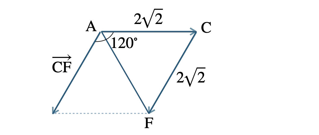 なす角 \( \theta \) は、\( \overrightarrow{\rm CF} \) を始点 \( \rm A \) に平行移動したとき、\( \theta=120^{\circ} \) となるので、