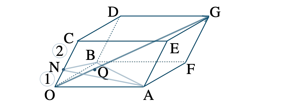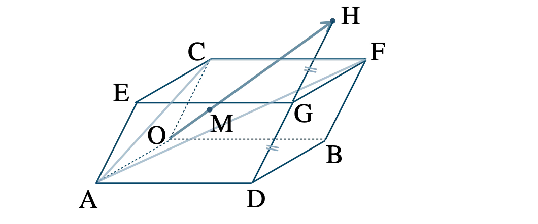 問題アーカイブ01平行六面体 \(\rm OADB-CEGF \) において、辺 \(\rm DG \) の \(\rm G \) を越える延長上に \(\rm DG=GH \) となるように点 \(\rm H \) をとる。直線 \(\rm OH \) と平面 \(\rm AFC \) との交点を \(\rm M \) とするとき、\( \overrightarrow{\rm OM} \) を \( \overrightarrow{\rm OA}=\overrightarrow{a}~,~\)\(\overrightarrow{\rm OB}=\overrightarrow{b}~,~\)\( \overrightarrow{\rm OC}=\overrightarrow{c} \) を用いて表せ。