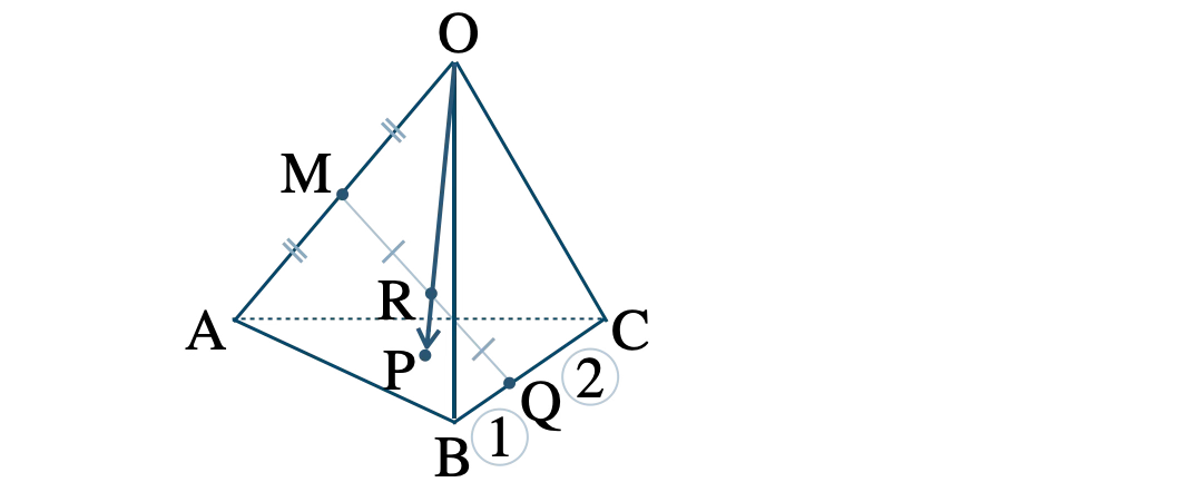 問題アーカイブ02四面体 \(\rm OABC \) において、辺 \(\rm OA \) の中点を \(\rm M \) 、辺 \(\rm BC \) を \( 1:2 \) に内分する点を \(\rm Q \) 、線分 \(\rm MQ \) の中点を \(\rm R \) とし、直線 \(\rm OR \) と平面 \(\rm ABC \) の交点を \(\rm P \) とする。\( \overrightarrow{\rm OA}=\overrightarrow{a}~,~\overrightarrow{\rm OB}=\overrightarrow{b}~,~\overrightarrow{\rm OC}=\overrightarrow{c} \) とするとき、\( \overrightarrow{\rm OP} \) を \( \overrightarrow{a}~,~\overrightarrow{b}~,~\overrightarrow{c} \) を用いて表せ。