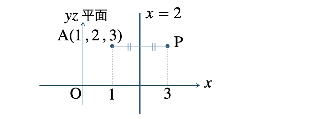 平面 \( x=2 \) に関して、点 \( {\rm A}(1~,~2~,~3) \) と対称な点 \( {\rm P} \) は、