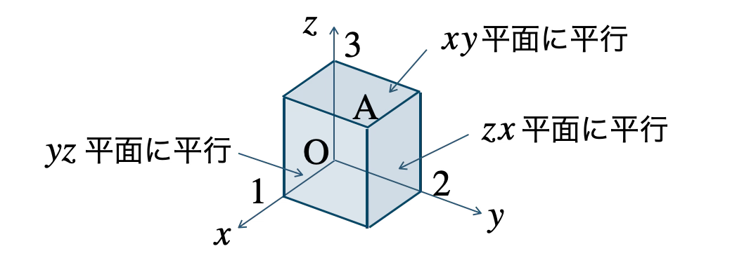 空間ベクトル 40座標空間の点 \( {\rm A}(1~,~ 2~,~ 3) \) を通り、\( x \) 軸に垂直、\( y \) 軸に垂直、\( z \) 軸に垂直、\( xy \) 平面に平行、\( yz \) 平面に平行、\( zx \) 平面に平行な平面の方程式の求め方は?また、平面 \(y=1\) に関して点 \({\rm A}\) と対称な点 \({\rm B}\) の座標や、平面 \(z=1\) に関して点 \({\rm A}\) と対称な点 \({\rm C}\) の座標の求め方は?