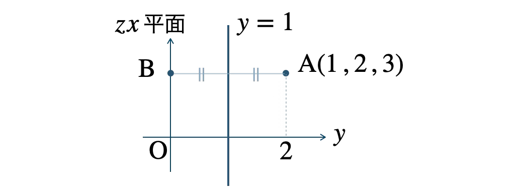 平面 \( y=1 \) に関して、点 \( {\rm A}(1~,~2~,~3) \) と対称な点 \( {\rm B} \) は、