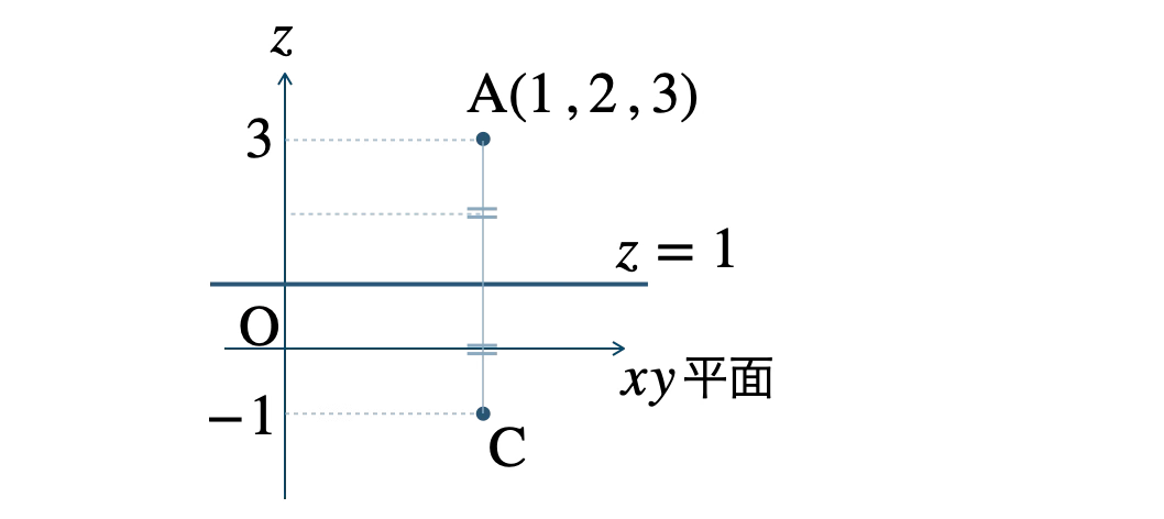 平面 \( z=1 \) に関して、点 \( {\rm A}(1~,~2~,~3) \) と対称な点 \( {\rm C} \) は、